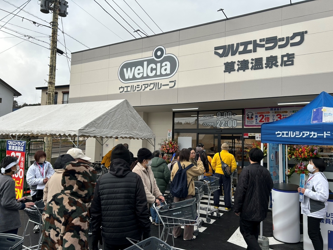 ドラッグストアの「マルエドラッグ草津温泉店」(草津町草津)が27日、オープンした。運営するクスリのマルエ(前橋市樋越町)によると、草津町への出店は初めて。地元住民ら30人が開店前から列をつくった。