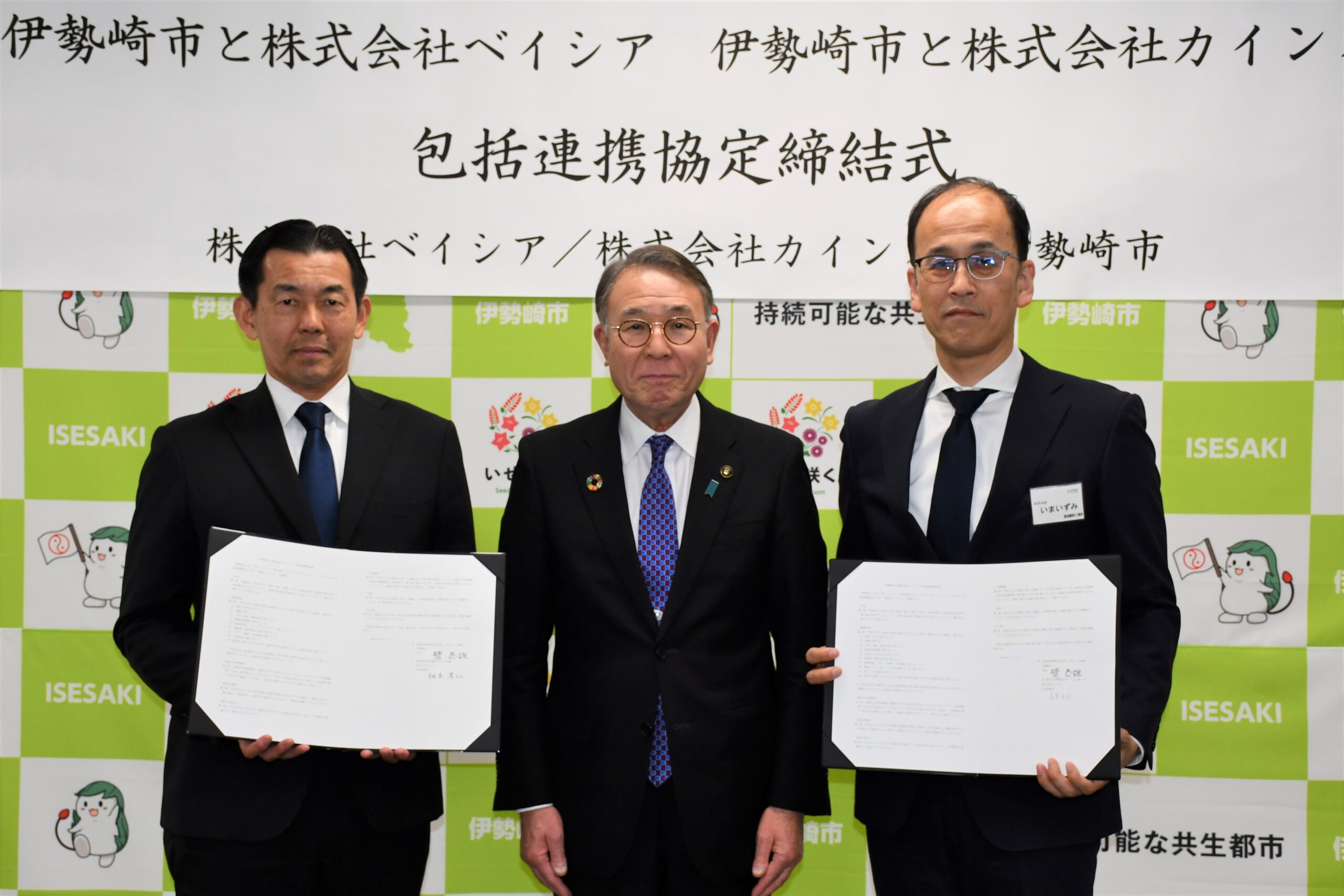 ベイシアの相木孝仁社長は「伊勢崎市はいせやの原点でありホームタウン。市民の力に少しでもなれるよう全力を尽くしたい」とあいさつ。カインズの今泉文弘販売本部第1ゾーンゾーン部長は「これまで積み重ねてきた取り組みをさらに深め、新たな共創のステージへ進む大きな一歩だ」と話した。